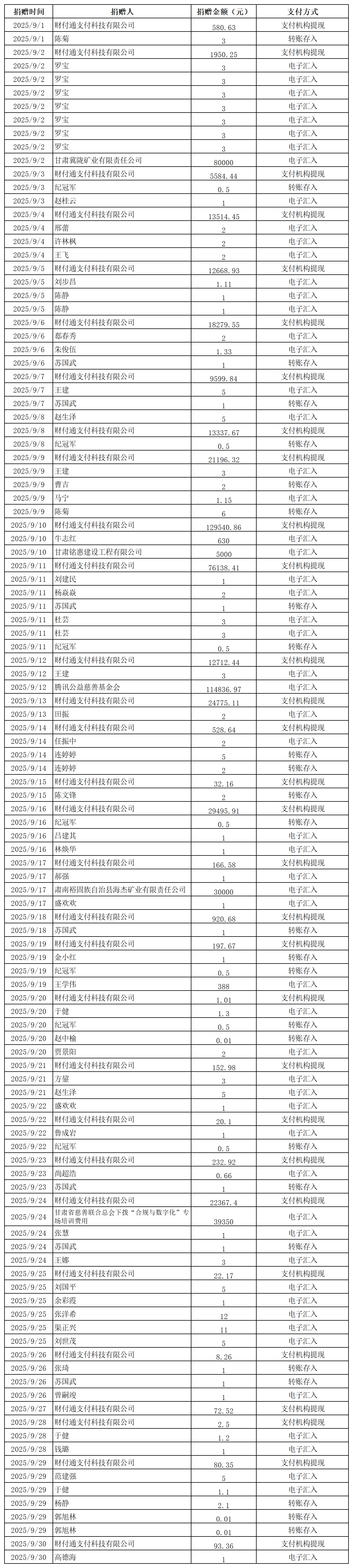 2025年張掖市慈善協(xié)會積極搭建愛心平臺,得到廣大愛心人士和愛心單位積極響應,踴躍捐款捐物,現(xiàn)將(2025年9月1日--9月30日)接收到的銀行轉賬收入公示如下: