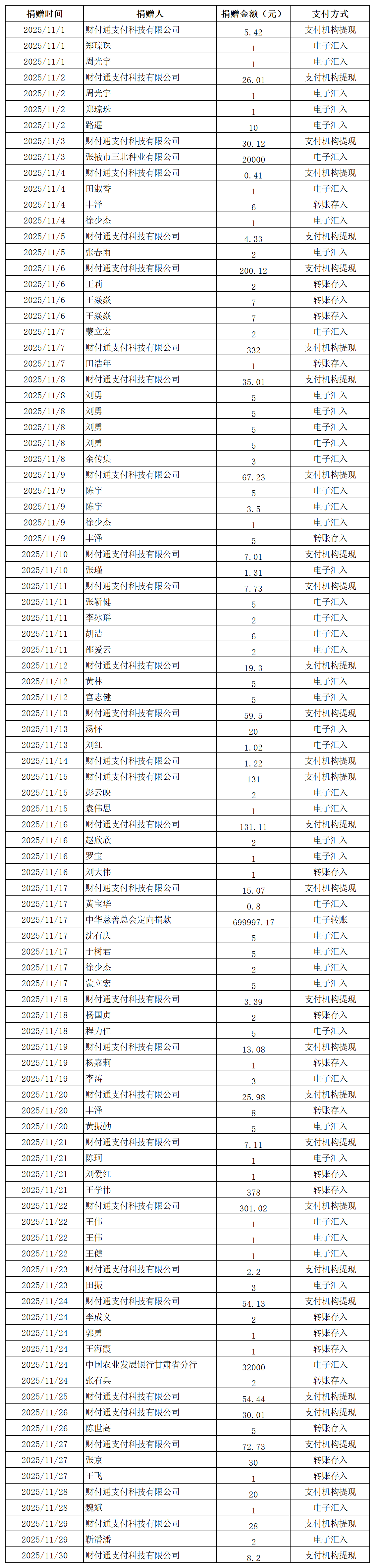 2025年張掖市慈善協會積極搭建愛心平臺,得到廣大愛心人士和愛心單位積極響應,踴躍捐款捐物,現將(2025年11月1日--11月30日)接收到的銀行轉賬收入公示如下: